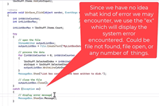 There are two things to consider here. We are working with a file so things can go wrong with the file. File not found. File corrupted. File in use. Those are just a few of the things that could happen when you are working with a file.