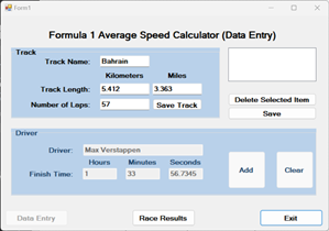 The best way to do that is to use the list box. (Add to list box flowchart PDF) That way we can calculate the MPH and the KPH for each driver and save that info with the name to the list box. When we are done entering all the driver info we will be in a position to save all the info to disk. Driver and Track PDF