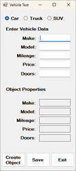 In this video we set up an instance of one of the derived classes based on which radio button is active. Car, truck or SUV data is entered, applied to a structure and that piece of data is added to a list. The purpose here is to let the user enter an unlimited number of vehicles to the list. The derived classes help to identify each type of vehicle being stored in the list. The list contains all the data and is available for other purposes.